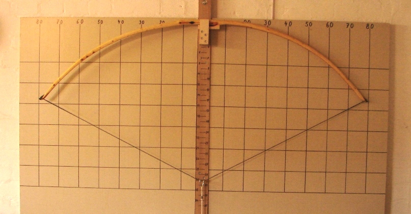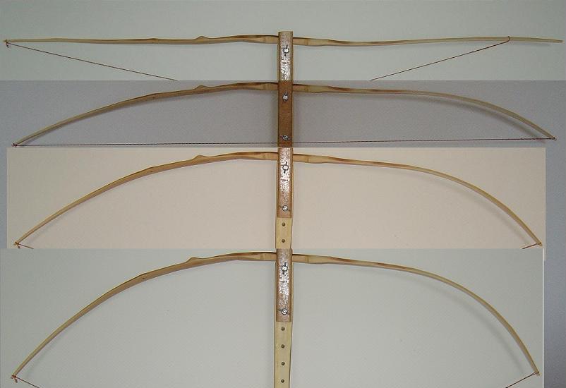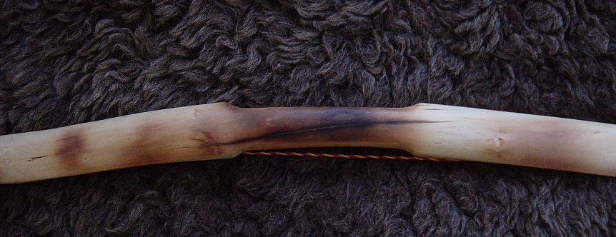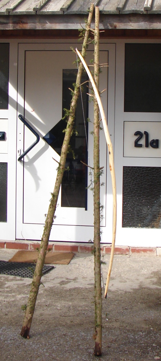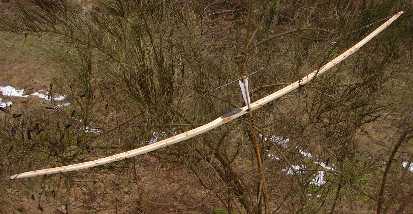 Entstanden ist dieser Bogen weil ich Wissen wollte ob es sich lohnt, solche dünnen Baumspitzen, wie man sie auf den meisten Eiben findet, mitzunehmen. Bisher habe ich solche Spitzentriebe nur zu Messergriffen, Pfeilsuchkratzern und Beilstielen verarbeitet. Ich muß sagen: „Ich bin Überrascht“. Ich hätte nie gedacht das der Bogen 50# erreichen kann und einen Auszug von 30“ Zoll ohne klagen aushält. Das Tillern war ein Witz, keine 30 Minuten und ich war bei 30“Zoll Auszug. Ich hatte mir die Seiten mit den wenigsten Ästchen als Rücken ausgesucht und die künftigen Bauchseiten mit der Kreissäge besäumt danach noch die Seitenflächen besäumt und die Rinde entfernt. Durch diesen gegebenen Taper fiel das Tillern sehr leicht. Die meiste Arbeit haben die Hornteile gemacht, ohne die, dauerte die Arbeit am Bogen höchstens 5 Stunden Netto. Oberfläche mit Leinölfirnis eingelassen, bis jetzt 3 Schichten.