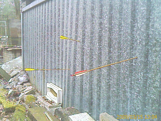 Beim ersten Probeschiessen im Winter mit meinem neuen Haselstecken hat der Pfeil das Pfeilfangnetz durchschlagen und ist dann unter das Klofenster im Wohnwagen eingeschlagen.