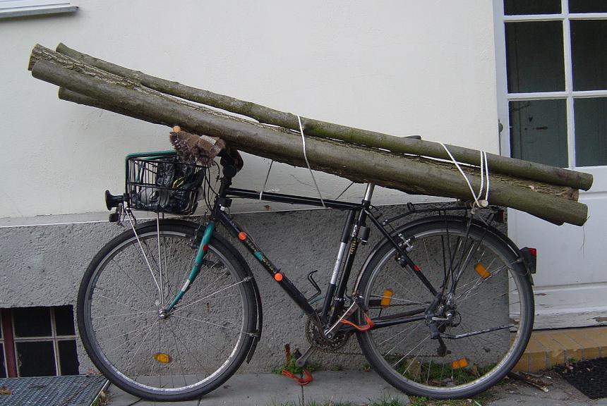 Unauffällig mit den Fahrad fort fahren und mit einem halben Festmeter Holz nach Hause kommen.