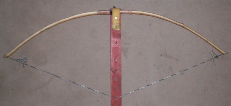 Ich habe nun eine neue Sehne gezwirbelt und bin bei einer Standhöhe von 13 cm. Da der Bogen ein Set von fast 8 cm im entspannten Zustand hat, ist er nun gaaanz leicht zu spannen