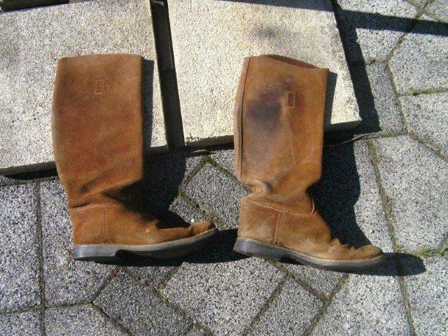 Mit den Stiefeln gibt es nur ein "Problem": auf den Fotos sieht man eh, die Innenseite ist abgewetzt. Kann man damit noch was machen? Oder ich dachte, schönere Seite für Köcher innenseite und aussen dann z.B. mit dem Hasenfell überdecken.