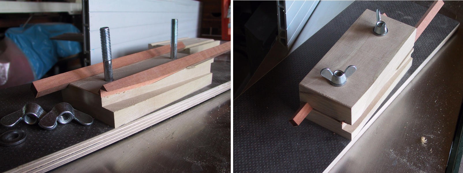 diese Hartholzstück jetzt in der Mitte teilen und, mit den Nuten innen, paßgenau zusammenlegen.