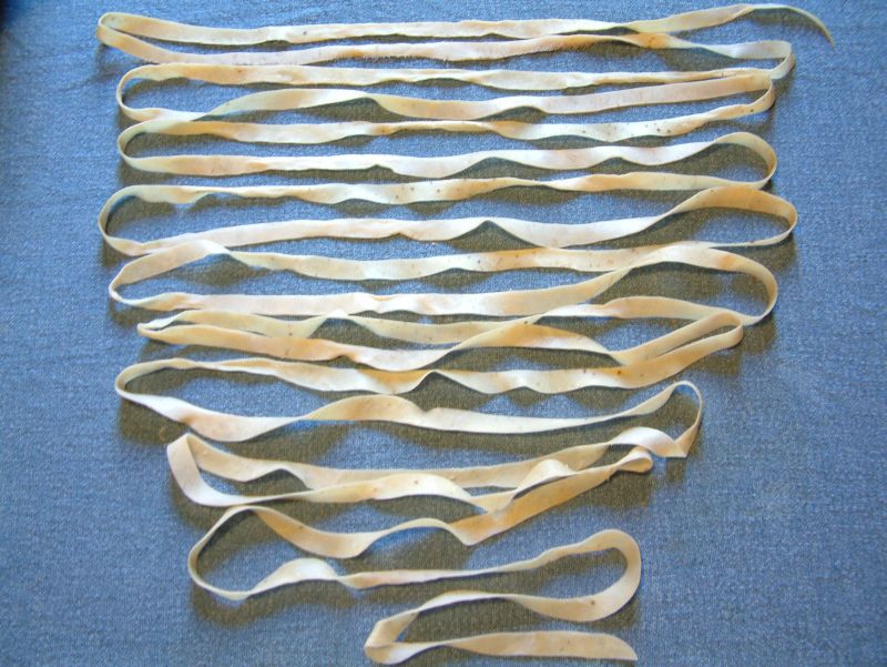 Eine Sehne läßt sich relativ einfach und schnell aus Rohhaut herstellen. Diese Sehne hat eine erstaunliche Reißfestigkeit. Ich habe die fertige Sehne über eine Reckstange gelegt und mit 70 kg (= 154 lb) belastet. Das hat sie locker weggesteckt.