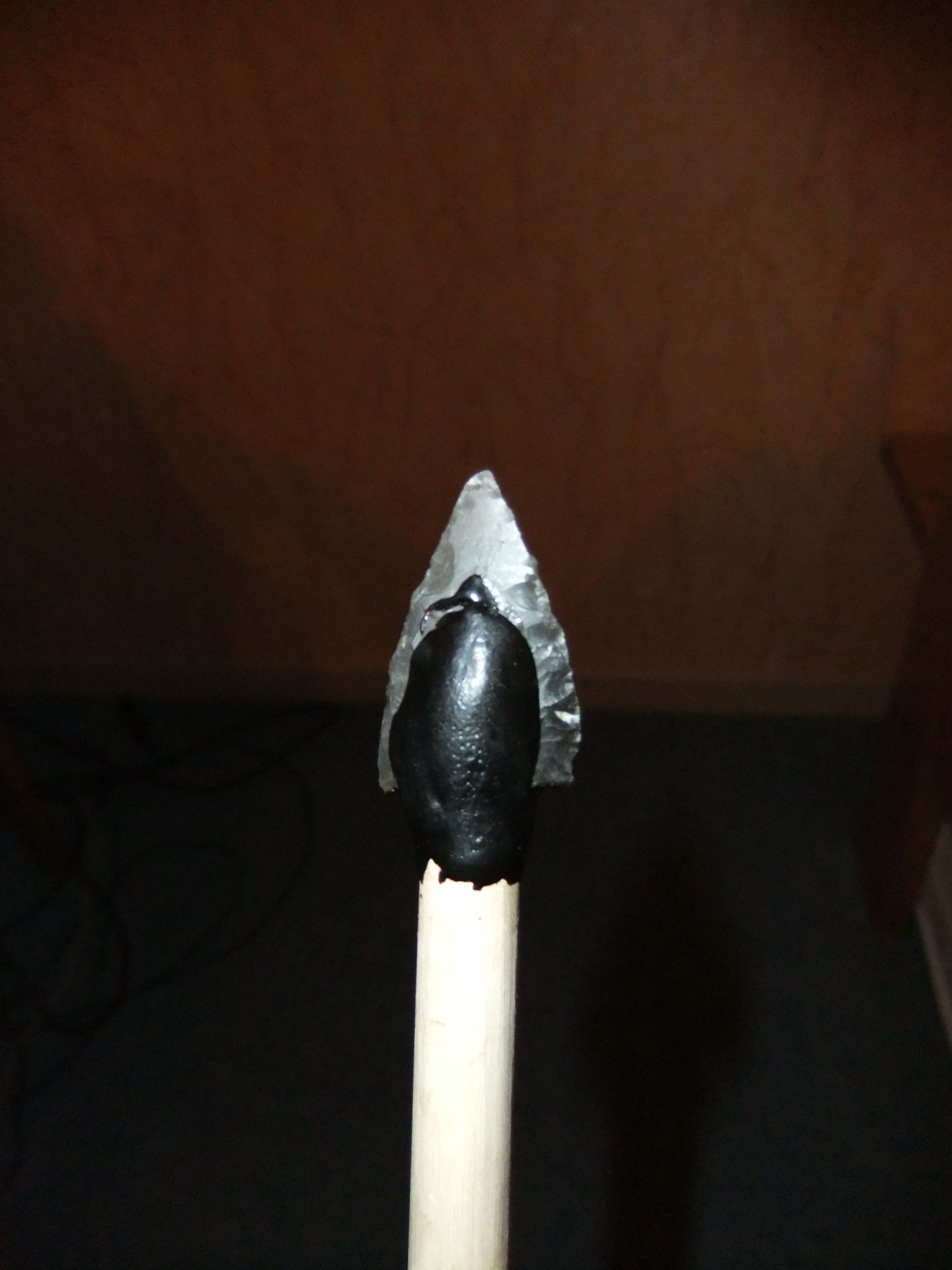 nein... unter der Spitze ist keine Wiklung... der Pfeil soll aber auch nicht geschossen werden, sondern nur rumstehen und gut aussehen ^^ Flintknapping habe ich mir in nem 2 wochen studuim über youtube beibringen können... macht unglaublich Spass, wenn man genau vorhersagen kann, wo was absplittert... oder ^^ ... oder auch nicht