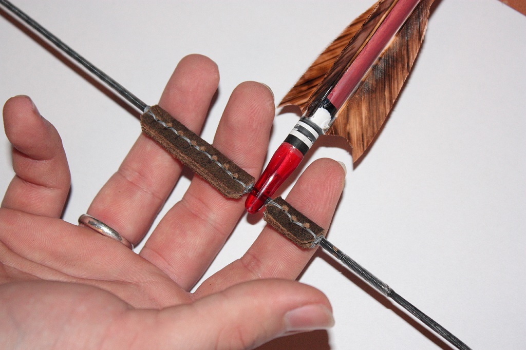 Was haltet ihr von der Möglichkeit das Leder um die Sehne zu wickeln und mir Garn oben und unten zu fixieren? (natürlich meine ich etwas dünneres Leder als hier verwendet wurde)