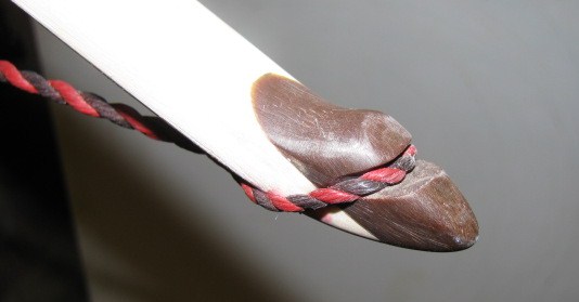 Élodie besteht aus 2 reinen Eibekernholzabschnitten, die im Griff mit einem Diagonalspleiß zusammengefügt sind. Am Rücken wird der Bogen durch ein 3mm Hickorylaminat mit stehenden Ringen gehalten.