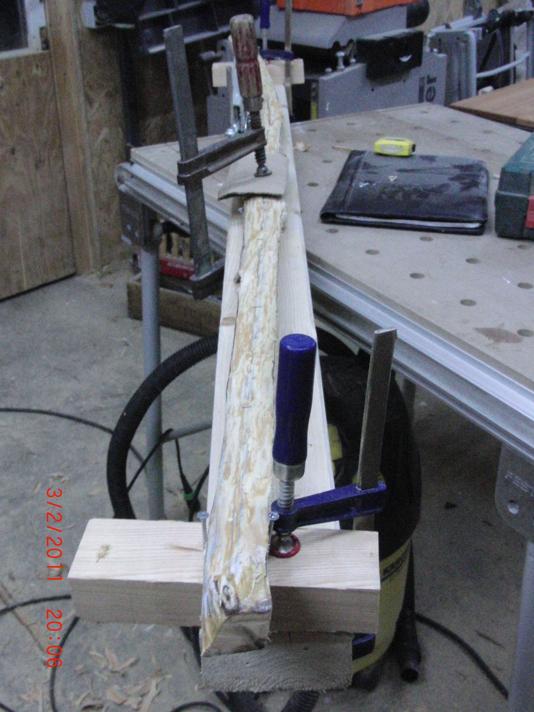 Dafür muß ein entsprechendes Holz ausgewählz , in Form gedämpft werden, der Bauch muß planiert werden zwecks guter Klebefuge, dann alles zusammen kleben .