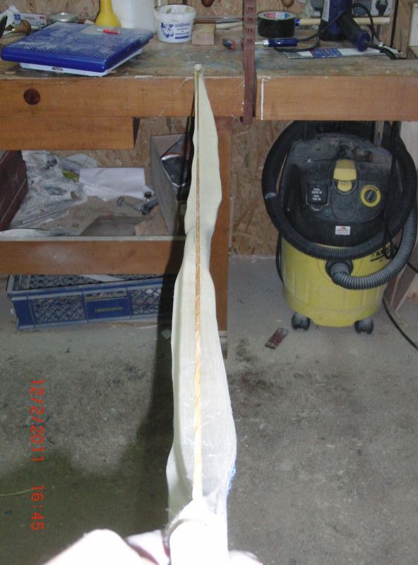 Länge liegt bei 158cm, davon 18cm Griff, an den Fades hat er 4cm und verjüngt sich auf 1cm, soll ein Bogen für mich werden, also geplante Auszugslänge 26", gewünschtes Zuggewicht 38#, mal sehen...