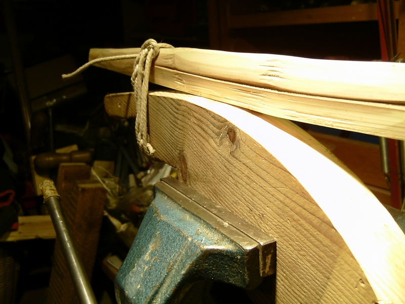 Länge derzeit 152 cm, es soll ein halbpyramedialer Bogen mit rund 50 bis 60 lbs werden. Die maximale Wurfarmbreite wird nur rund 33 mm betragen, denn mehr gab das Holz leider nicht her.