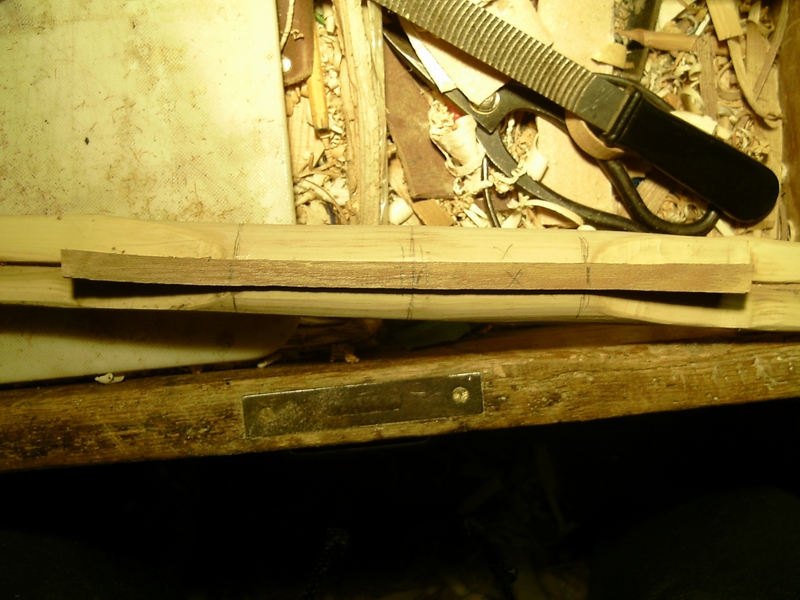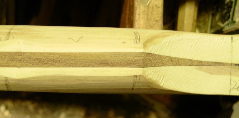 So, Fortschritt bei mir: Riss-Kosmetik im Griffbereich! Zur Erinnerung: Ich hatte, weil die Flieder-Staves dünn waren, im Griffbereich den vollen Querschnitt belassen. Weil Flieder aber ohne Ende reißt, den Griff mittig geschlitzt, um wenigstens den (unvermeidlichen) Riss vorzugeben! Man gut! Der Spalt hat sich fast 1 cm breit geöffnet!