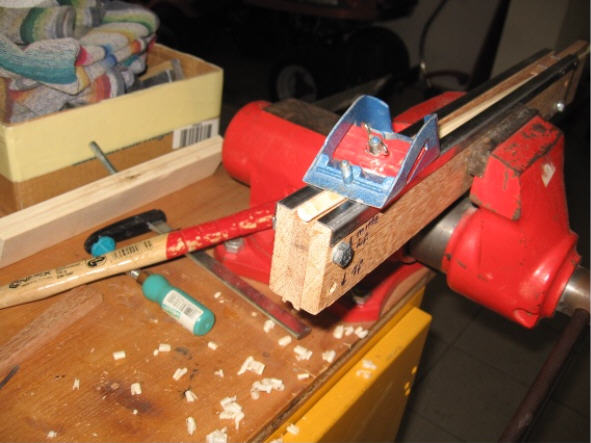 Mit dem etwas umgebauten Tool von Klaus1962 habe ich dann den Schaft zu einem Keil gehobelt wobei ich das Tool so eingestellt habe, dass der Keil vorne noch 1mm dick ist. (Beim Hobeln der 2. Seite hilft ein Nagel vorne, das sich der Schaft nicht nach unten drückt)