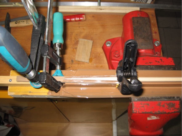 Danach wird der Spleiß verleimt. Ich habe wasserfesten Holzleim genommen, funktioniert sehr gut.
