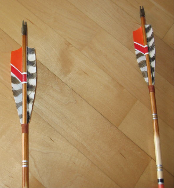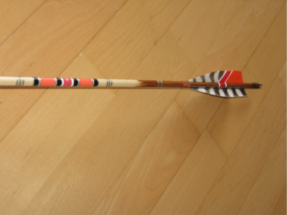 Die Federn sind 4" lang und haben Shield Form. Die Tracer sind aus weißem Kaninchenfell welches ich mit Haarfarbe vom Friseur gefärbt habe. Ein Schaft wurde zu einen FLUFLU (doppelte Klobürste - gezeigt im Buch von Volker Hübschmann)