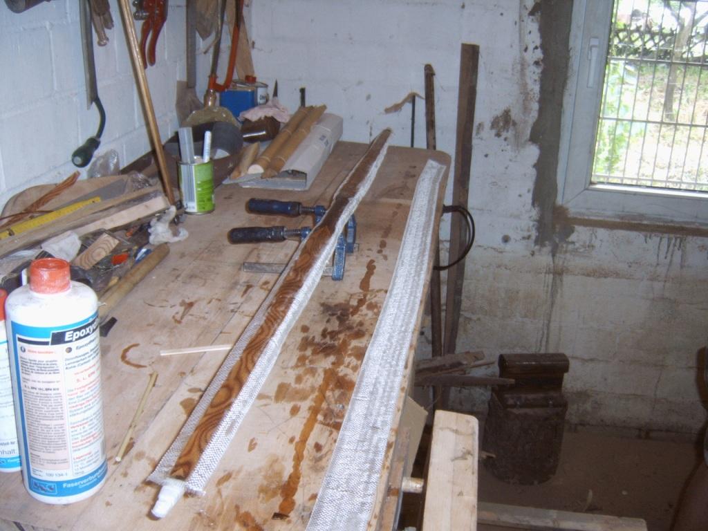 Für einen Bogen mit den Maßen 1,48m, Wurfarmbreite 35mm, der mit 2 Streifen Glasfaserband belegt werden soll, sollte man schon gut 30g Epoxyd anmischen, bei einem Streifen reichen 20g...