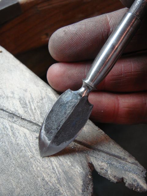 Ein Tipp beim Kalt-Schmieden flacher rautenförmiger Profile ist dass das Werkzeug nie poliert sein darf weil es dann zu rutschig ist. Sowohl Hammer als auch Amboss werden von Zeit zu Zeit mit Schmirgelpapier angerauht, so kann man das Werkstück schräg formen ohne dass es weg rutscht.