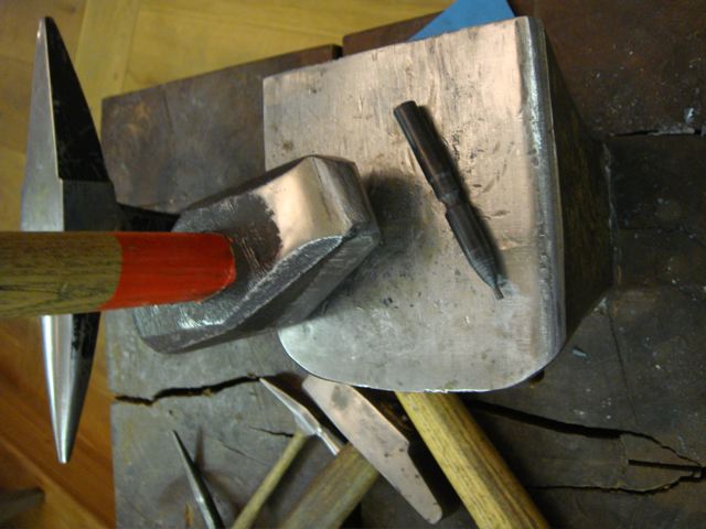 Und wie oben schon gesagt das Werkzeug muss rauh sein - das heisst man muss es eigentlich nur entfetten. Amboss und Hammer werden bei der Arbeit schnell glatt. Man schruppt sie regelmässig mit Schmirgelpapier um sie griffig zu machen, dann rutscht das Werkstück weniger beim Schräg-Schmieden - das gilt für Kalt-Bearbeitung, warm muss man einfach gut festhalten oder auf der runden Kante schmieden so dass man die Flächen leicht hohl macht, geglättet sind sie dann leicht.