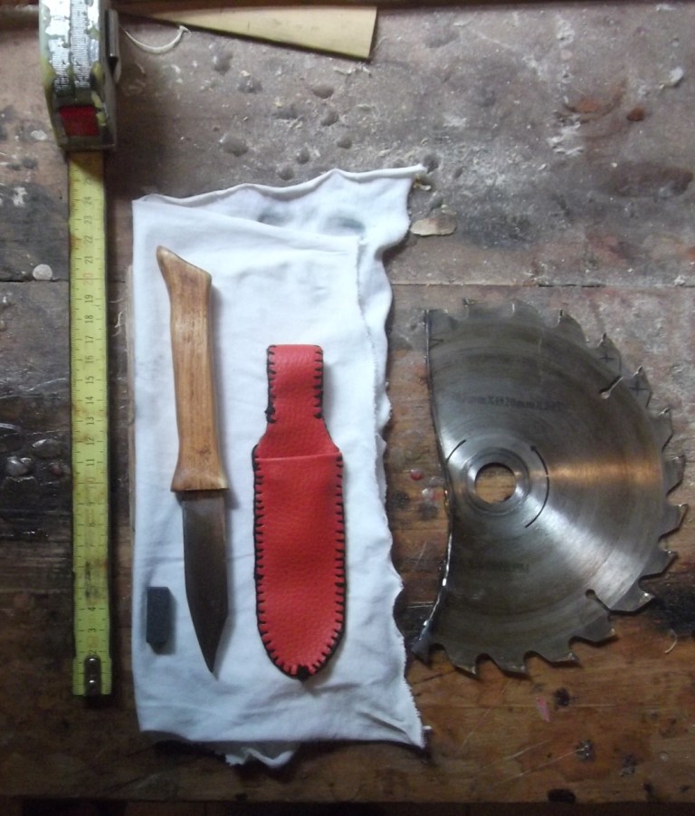 Angeregt von Mike W.´s Messerbau hab ich die Klinge schlicht aus einem ausgedienten Handkreissägeblatt (d=180mm) per Flex ausgeschnitten und in Form gebracht, ohne weitere Härtebehandlung oder sonstiges... naja, natürlich noch geschliffen und versucht, die Oberfläche etwas zu polieren...