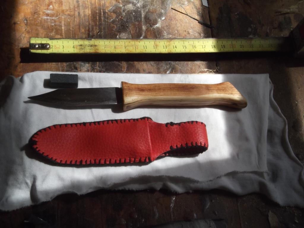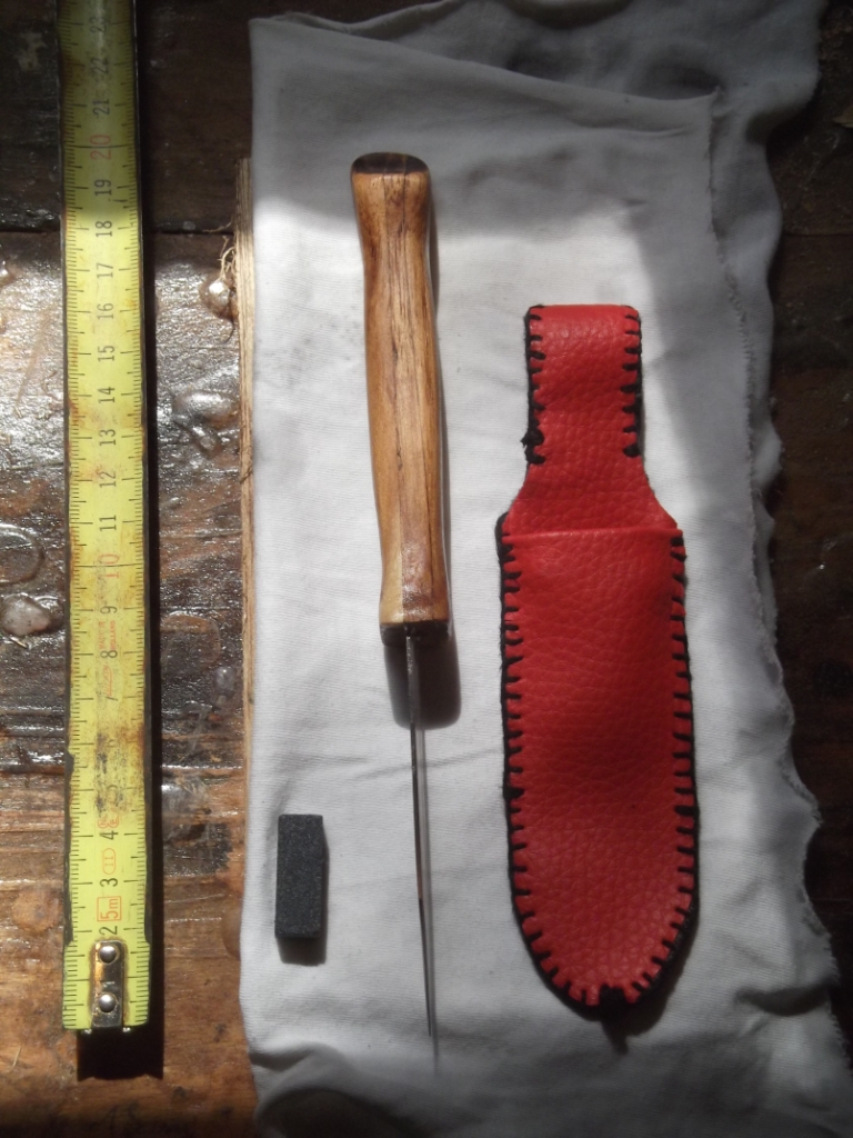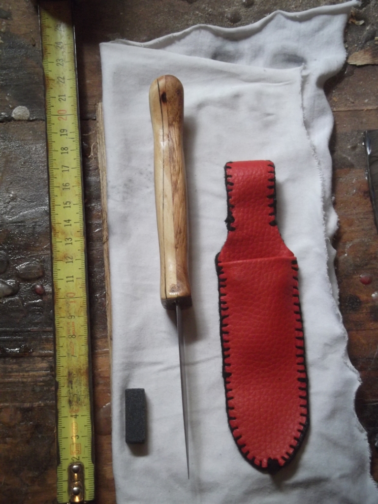 Der Griff ist aus einem aufgesägten Stückchen Hickory, daß noch vom letzten Bogen über war und die Scheide ist aus 4 Lagen Kunstleder zusammengenäht...