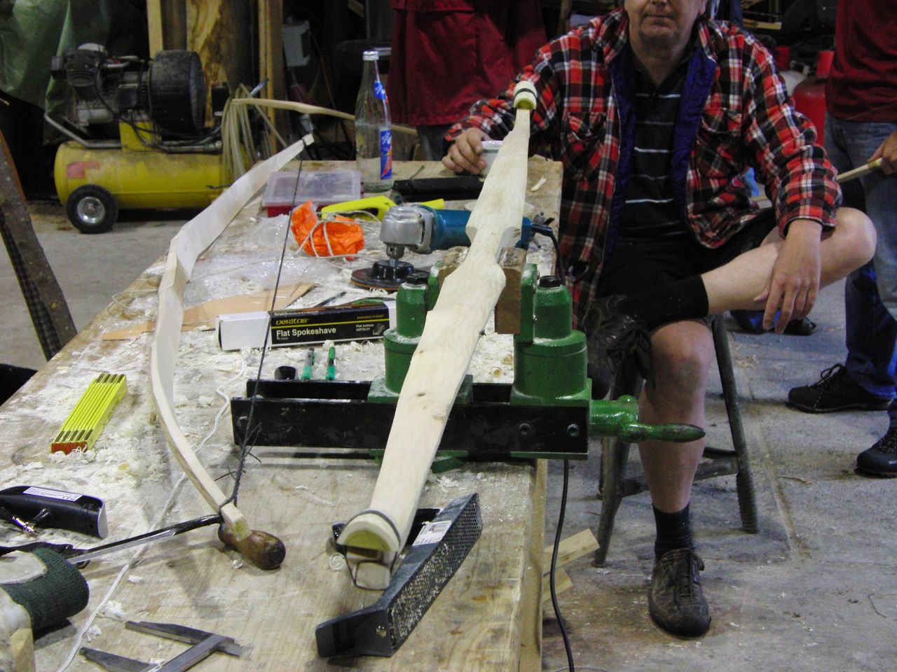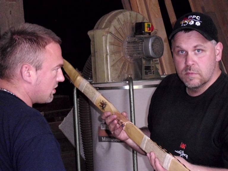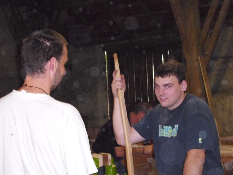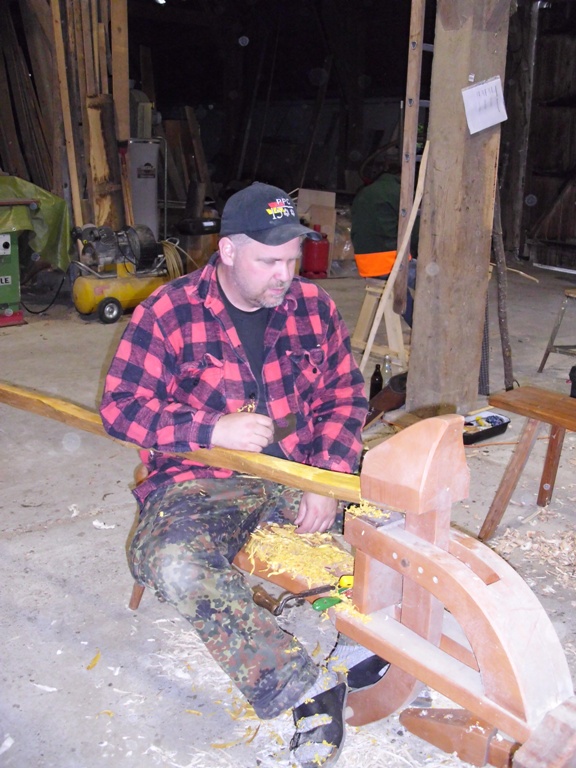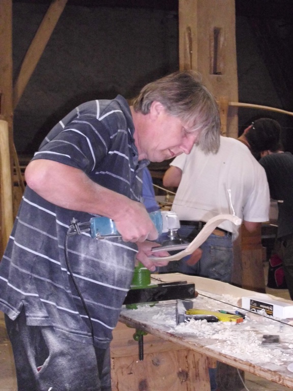 Dies änderte sich jedoch bald und schnell war die Scheune von fleissigen Bogenbauern bevölkert. Holger an seinem Hickory Flatbow