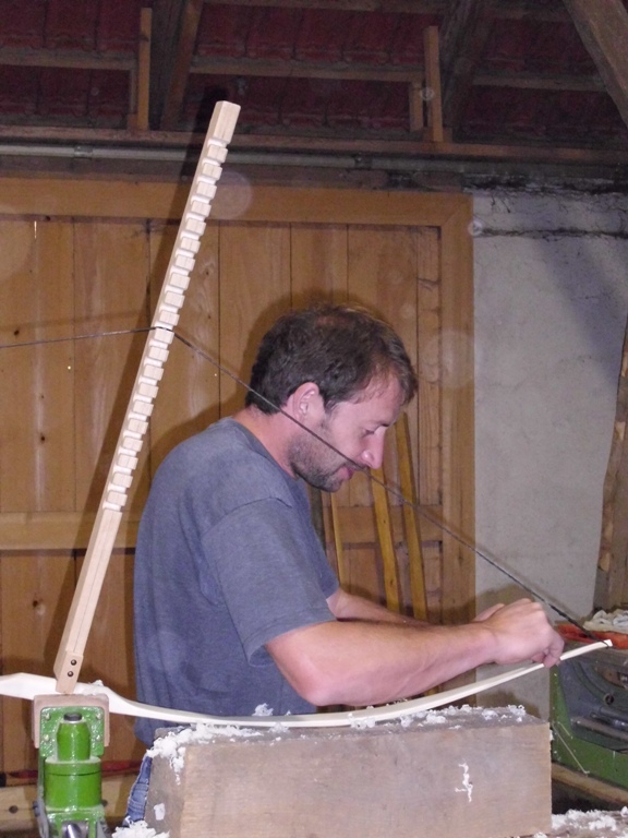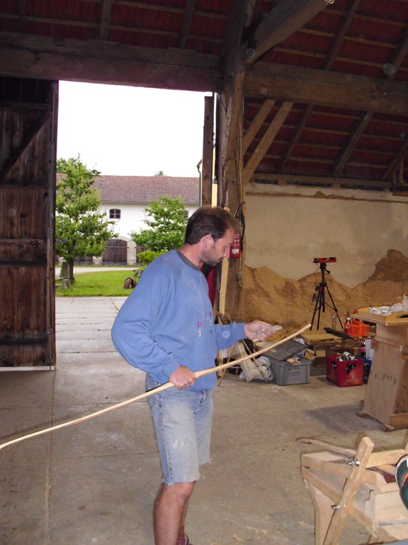 Dies änderte sich jedoch bald und schnell war die Scheune von fleissigen Bogenbauern bevölkert.  Holger an seinem Hickory Flatbow