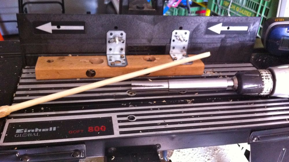 So jetzt hab ich ein paar Schäfte produziert und bin draufgekommen das die Befestigung nicht optimal ist. Das ganz muss wirklich absolut wackelfrei montiert werden. Also einen neuen Holzklotz gebohrt und direkt auf die Arbeitsfläche mittels Langloch geschraubt. Das Ergebniss ist doch besser und das Fräser kann sich nicht mehr verstellen.
