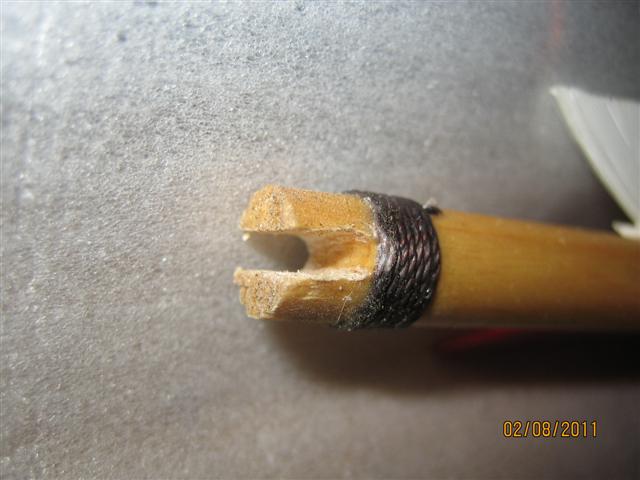 Nur etwas zur Optik: Ich würde die Nocke immer rundschleifen, also die Kanen abrunden. Außerdem würde ich Selfnocks immer 1cm tief machen. Das Garn dass Du verwendest ist viel zu grob. Du solltest sehr sehr feinen Faden verwenden, diesen dann mit einem Kleber (z.B. UHU-hart) überziehen.
