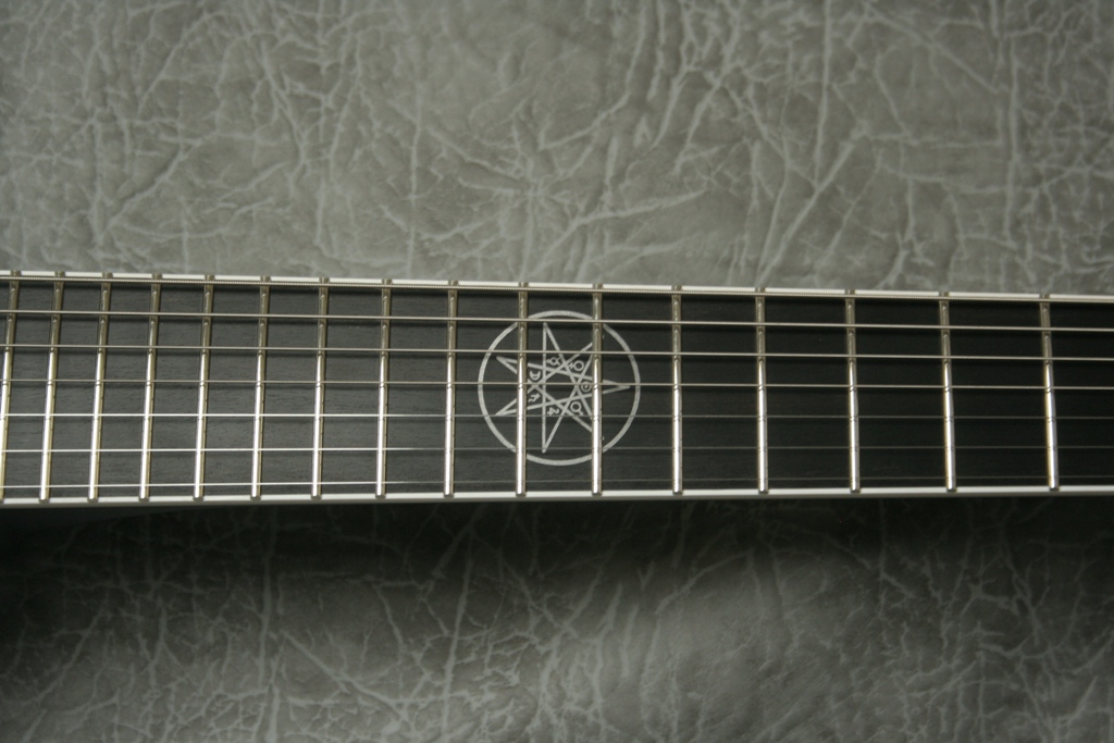 Hier mal meine speziell für mich gebaute Custom 7saiter Gitarre. Ich hab damals sogar die Korpusform selbst entworfen, ist also auch in dieser Hinsicht ein echtes Einzelstück. Es gab aber auch keine Serienklampfe die alles so hatte wie ichs wollte