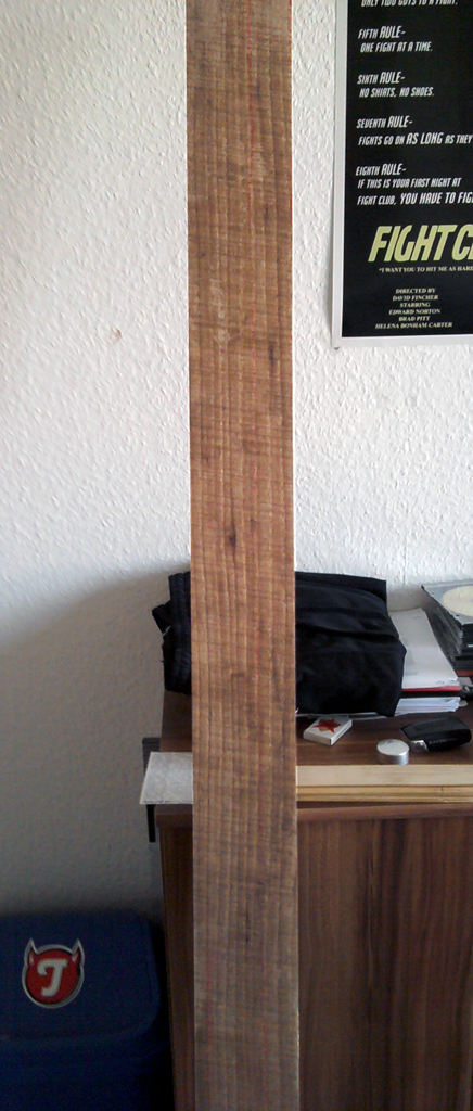 ich hab mir beim Schreiner eine dicke Ulmenbohle besorgt, welche meiner Meinung gut zum Bogenbau geeignet ist. Sie ist etwa 180x10x6 cm und hat stehende Ringe, von denen der stärkste ca. 1,8cm breit ist (Ringe stehen etwa 90-70° im Holz). Ansonsten hat sie für mich keine erkennbaren Äste, höchstens einen kleinen Astansatz. Wenn ich mich nicht vergucke, könnte der poröse Frühholzanteil bei zwei Ringen etwas geringer sein, der Rest müsste aber in Ordnung sein. Maserung und Faserverlauf sehen auch sehr gut aus und verlaufen nahezu parallel im Holz, d.h. ich kann keinen auslaufenden Jahresring ausmachen. Die Bohle wurde zwar kammergetrocknet, hat aber laut Aussage des Chefs nie 8% Holzfeuchte unterschritten und wurde seit diesem Sommer draußen gelagert.