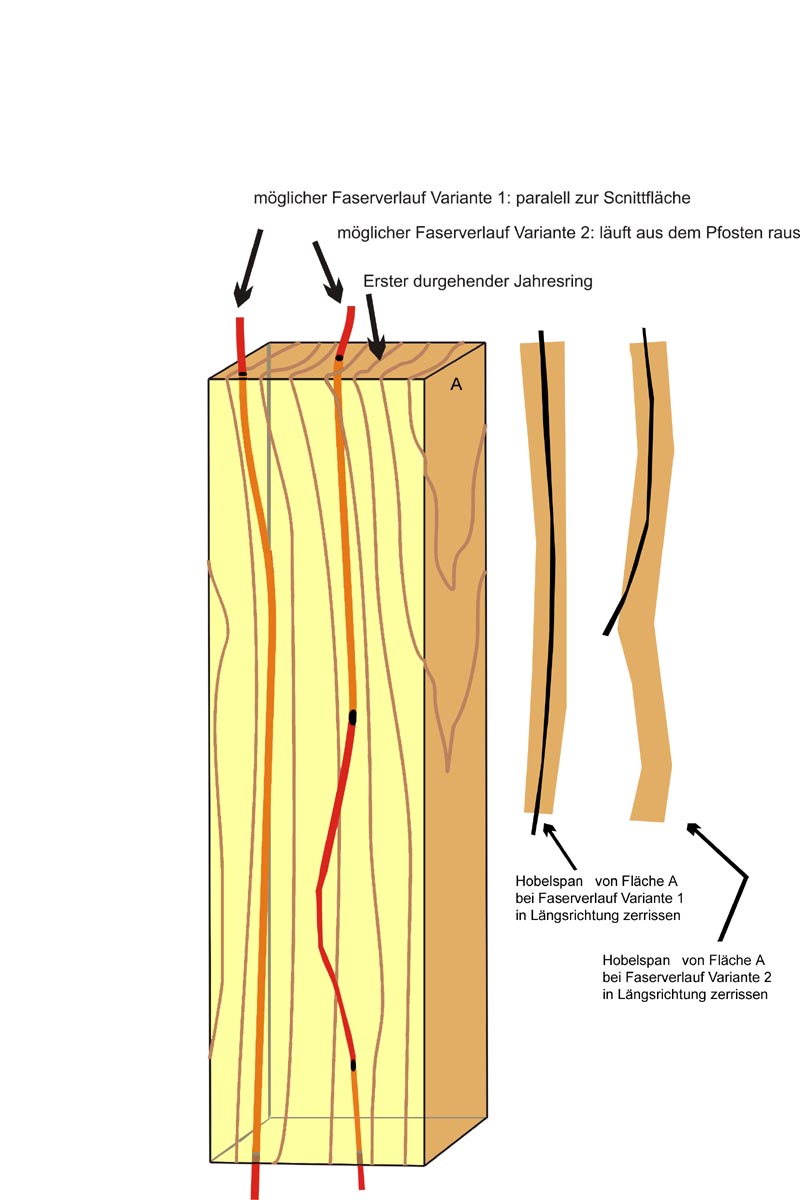 Da die Voraussetzungen die ein Holz mitbringen muss um gut mit stehenden Ringen verarbeitet werden zu können, scheinbar oft Schwierigkeiten machen hab ich mal eine Skizze gemacht. bei Brettern, Bohlen, Pfosten usw. also bei allem was gesägt ist, sind zwar die Jahresringe sichtbar, allerdings der Faserverlauf im rechten Winkel auf die Jahresringe ist nicht zu sehen. Gerade auf diesen Faserverlauf kommt es aber an. Wie Dirk schon geschrieben hat sollten bei stehenden Ringen die Jahresringe über die ganze Länge parallel verlaufen, also keine Dickeinschwankungen aufweisen und günstig ist auch wenn sie nicht übertrieben dick sind. Trotzendem kann es schwierig sein den Faserverlauf zu beurteilen, ich helf mir da immer so wie auf der Skizze zu sehen, also einen schön langen Hobelspan ( mit einem scharfen Handhobel und ein bisschen Übung sind bis zu 1m lange Späne kein großes Problem) von der bezeichneten Seite des Holzes (idealerweise entlang der vorderen oder hinteren Kante) abziehen und der Länge nach in den Mitte zerreißen. Wenn der Span über die ganze Länge mittig zerreißt dann hat man für die Verarbeitung mit stehenden Ringen geeignetes Holz, läuft der Riss allerdings aus dem Span raus sollte man Verarbeitung mit stehenden Ringen ganz schnell vergessen.