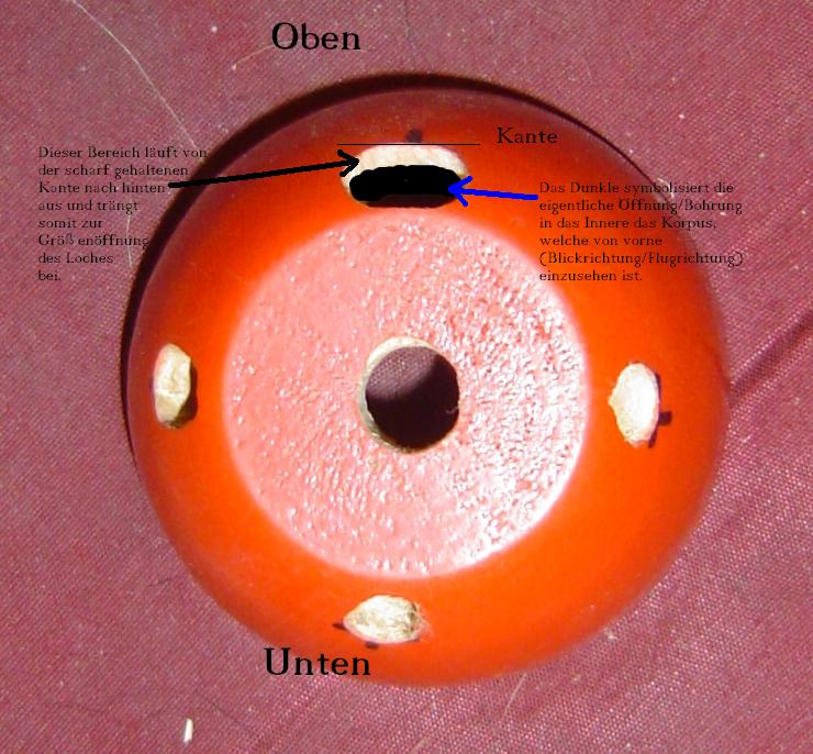 Was mir in den Versuchen aufgefallen war, ist, dass wenn die Kante oben, dort wo sich die Luft bricht und ein Teil in die Flöte gedrückt wird, schön scharf ist, leichter ein Ton entsteht. Und, ich stellte auch fest, dass es richtig gut funktioniert, je weniger Material von der oberen Innenwand des Loches direkt von vorne zu sehen ist.