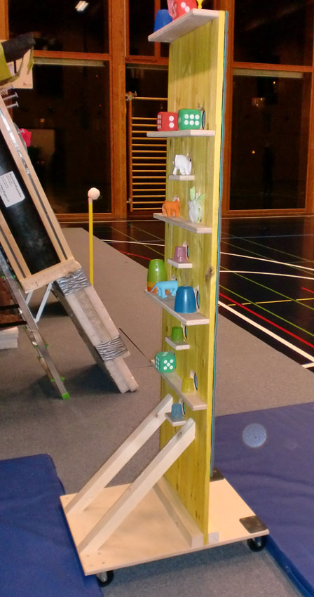 Die Holzplatte ist mit einer dicken Gymnastikmatte überzogen. Diese sollte die Plattentreffer abdämpfen.