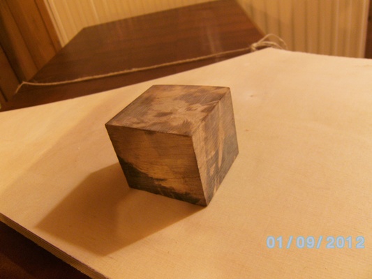 Ein Würfel aus stabilisierten Holz und die Halbierung.