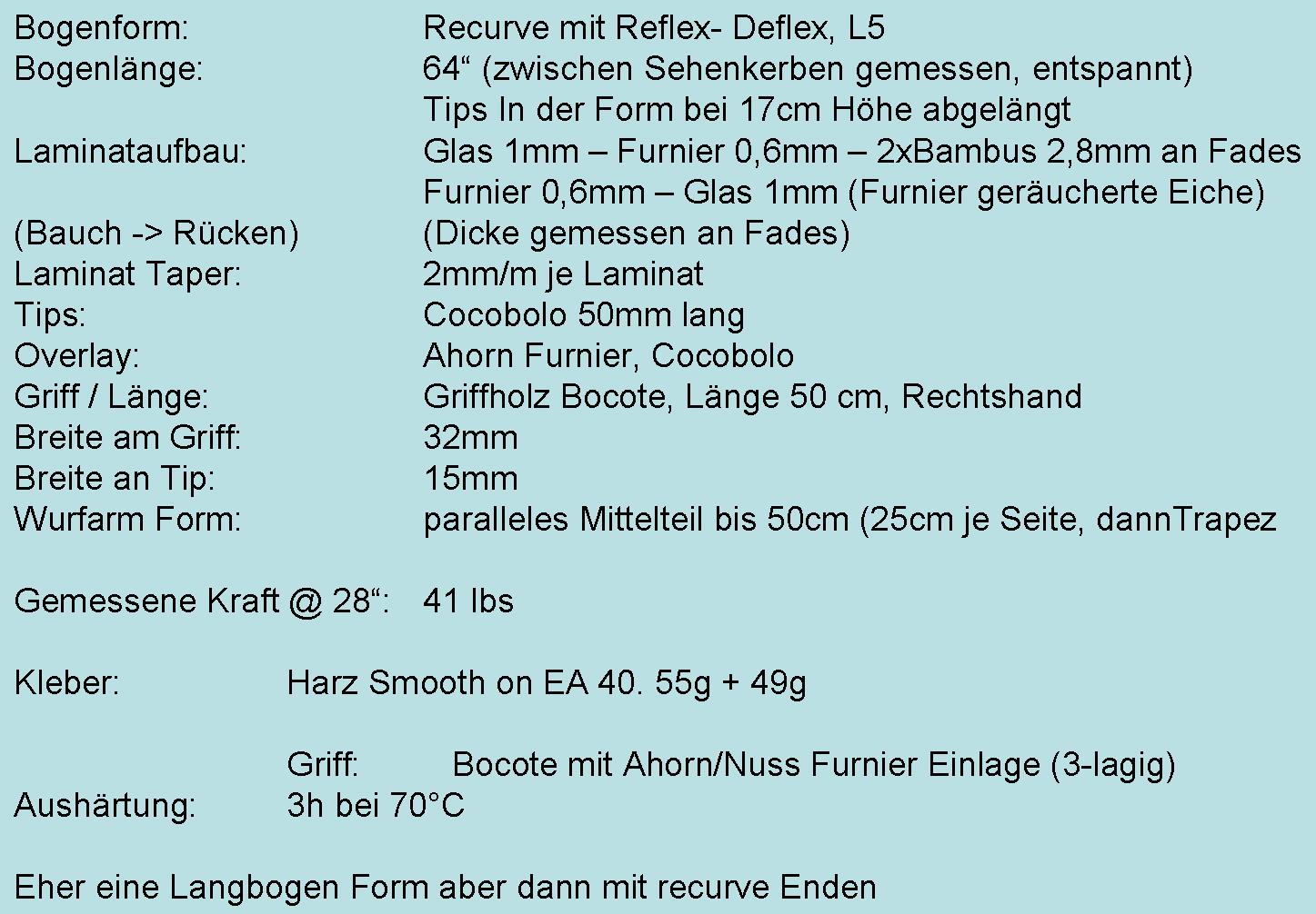 Die Wurfarme sind wieder mit Bambus Kern und geräucherte Eiche als Zierfurnier mti Klarglas drauf. Das Overlay ist Cocobolo mit Ahorn, Tips sind ebenfalls Cocobolo.