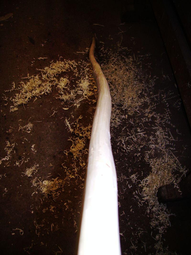 Da ich irgendwie im Moment keine Lust habe einen Flachbogen mit breiten Wurfarmen zu bauen, hab ich einfach "drauflos" geschnitzt (zu warmwerden :) ). Dabei herausgekommen ist eine Art Mischform. An einigen Stellen habe ich nun einen runden Querschnitt und an anderen ein hohes D- Profil.