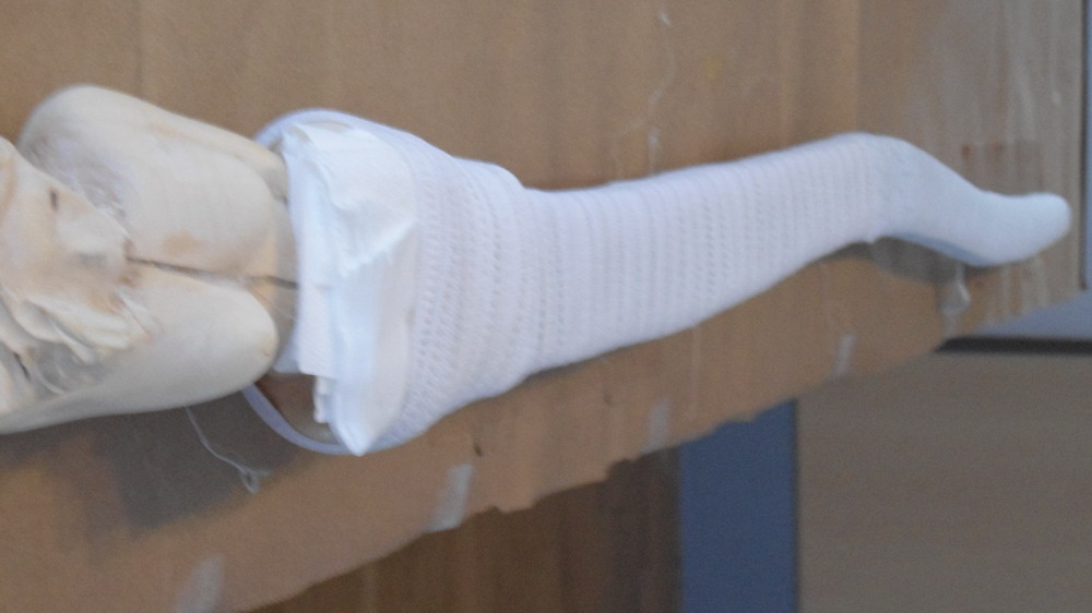 Sehnenbacking wurde mit Hasenhautleim aufgebracht und mit Parafilm (Semipermiabler dehnbarer Film aus dem Laborbedarf) abgedeckt und mit Hosengummi gesichert. Nach dem Sichern mit dem Haarfön aufgewärmt, der Parafilm ist an den gedehnten Stellen sehr hitzeempfindlich daher löst es sich dabei an der Kante auf und der überschüssige Hasenhautleimm tritt seitlich zwischen dem Hosengummi aus. Nach einer Stunde ist das ganze soweit geliert, dass der Hosengummi wieder runter kann.