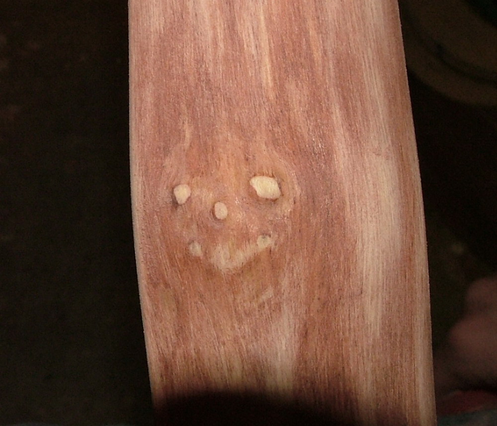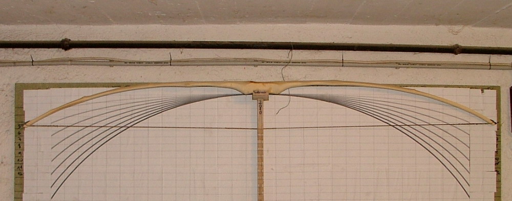 So wird das nichts. Der Drehwuchs ist einfach zu stark. Anfangs bogen sich die Wurfarme so weit zur Seite, das die Sehne immer an der Unterarm schlagen musste. Durch asymmetrisches Abtragen an den WA konnte ich die Sehne zwar wieder über den Griff bekommen, aber die WA verdrehten doch sehr stark. Am Ende waren die Wurfarmenden je um ca. 40- 45° zum Griff gedreht. Das liegt zum Teil am Drehwuchs, zum Teil aber auch an der Wuchsform als ganzes, da die Enden nicht in der Flucht des Griffes liegen. Der größte Zug lag also auf einem sehr schmalen Grat an der Seite des Wurfarms. Das kann nicht auf Dauer gut gehen. Also, da hilft nur ein neuer Anlauf. Ich verzichte auf alle Sicherheitsreserven und kürze den Bogen um 12 cm auf 170cm und tillere noch mal von vorne los. Diesmal mache ich den Bauch absolut flach, das kann verdrehen und seitwärts weg biegen mindern. Andererseits ist das Bearbeiten von ganz flachen Bogeninnenseiten aufwendiger als bei leicht gewölbten Bäuchen.