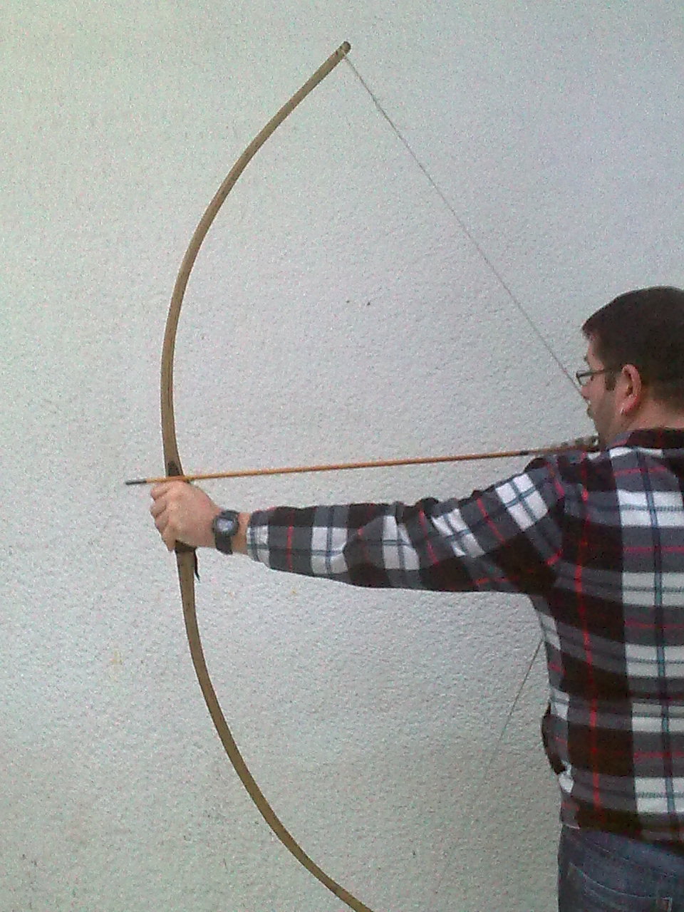 Die Idee dahinter war, einen schlichten, funktionalen Bogen zu fertigen und sich dabei auf wenige "einfache" Werkzeuge zu beschränken. Aufgrund der natürlich gewachsenen Form des Holzes, hatte ich mich entschlossen, dem Bogen ein dem Winkingertypus ähnliches Design zu geben; daher die "langen Nocken".