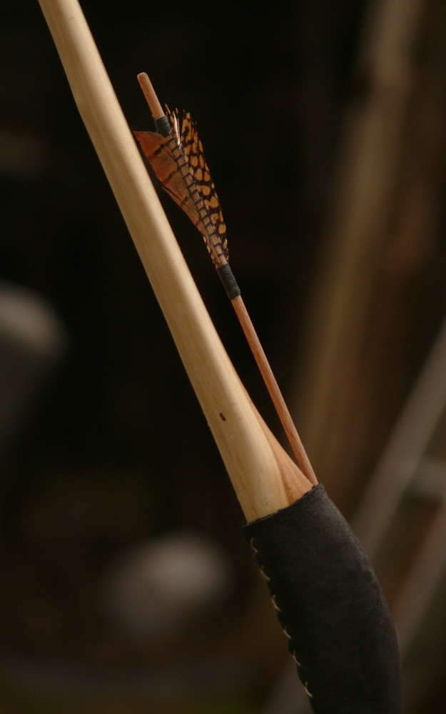 Die Idee dahinter war, einen schlichten, funktionalen Bogen zu fertigen und sich dabei auf wenige "einfache" Werkzeuge zu beschränken. Aufgrund der natürlich gewachsenen Form des Holzes, hatte ich mich entschlossen, dem Bogen ein dem Winkingertypus ähnliches Design zu geben; daher die "langen Nocken".