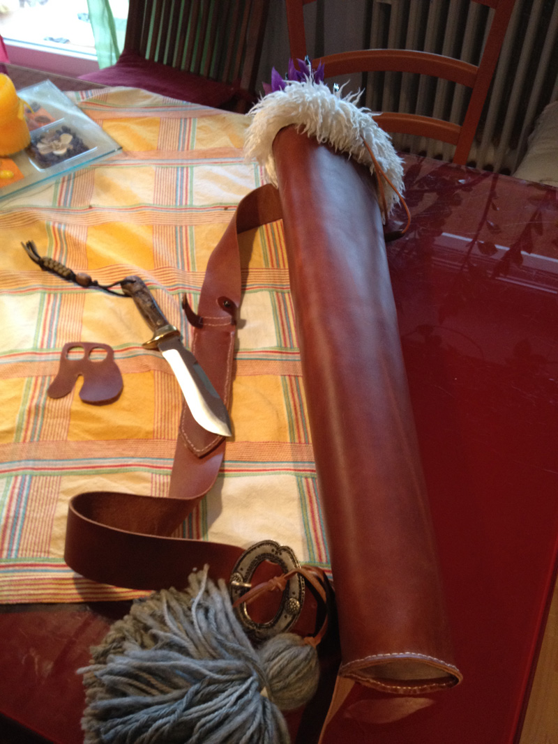 Er besteht aus 4mm starkem Leder,ist im Taschenbereich doppelt gelegt,+bietet Platz für 8Pfeile.In dem Besatz an der Tasche ist ein Kupferdraht eingearbeitet-so bleibt die Öffnung komfortabel geöffnet im Gebrauch.Die Messerscheide stammt aus meinem Fundus+passte(m.E.) zufällig gut dazu.Fixiert ist sie mit Lederbändern,die zum wechseln einfach geöffnet werden können.Genäht habe ich mit 2Nadeln+ Wickelgarn.Die Lochabstände habe ich mit einer Kuchengabel markiert+danach gebohrt.