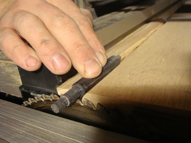 Will man den Hornstab nach dem Schneiden des Zapfens noch gesamt dünner machen so stellt man einfach die Säge ein wenig (um etwas mehr als die Schaft-Wandstärke) tiefer und nimmt vor dem Zapfen noch etwas Material ab.