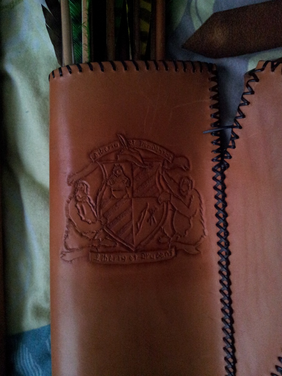 Im gegensatz zu meinen Erstlings-Punzierwerken hatte ich hierbei einen Kollegen aus dem Bogenverein der mir einige Tips gab (z.B. dass man das Leder nicht nur feucht, sondern richtig einweichen muß). Das Motiv ist das Wappen der stolzen und freien Bogenschützen von Ankh-Morpork (Pandabär-Edition... lange geschichte) und ich war bis vor kurzem noch recht stolz darauf.