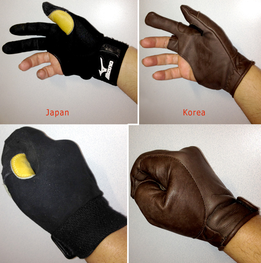 Der Koreanische Handschuh ist auf Grund seiner stärkeren Polsterung zwar nicht so „gefühlsecht“ an der Sehne aber natürlich unempfindlicher für den Daumen. Beim Japanischen spüre ich ganz genau wo und wie die Sehne auf dem Daumen liegt trotz des zusätzlichen Leders am Daumen. Hier muss ich aber sagen dass mir bei längeren Trainingseinheiten der Daumen dann doch recht schnell empfindlich wird. Trotzdem hat man mit beiden Handschuhen den dreh recht schnell raus und es kommen gute Ergebnisse dabei heraus.