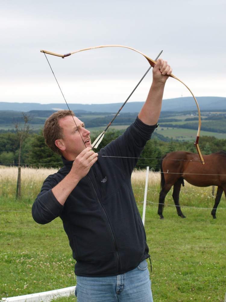 Pfeilgeschwindigkeit mit einem 10 grain per lb Pfeil aus Bambus, 60 cm lang, 6 mm dick: 140 ft/sec bei Auszug 50 cm und 26 lb