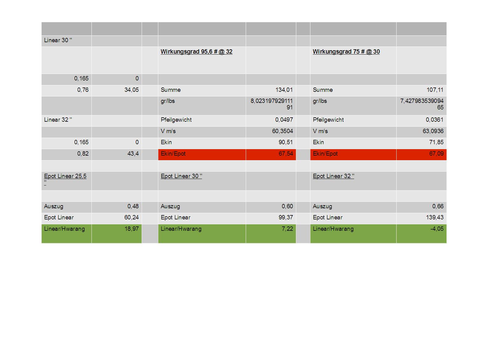 Ich füge ein Kraft-Weg Diagramm bei, aus welchem die Zugkraft bei entsprechendem Auszug abgelesen werden kann. Geschossen habe ich den Bogen mit Daumentechnik. Getestet habe bei zwei Auszügen. 30 '' mit 75 lbs und 32 '' bei 95,6 lbs (oder 34 kg bei 76 cm und 43 kg bei 82 cm). Dafür standen zwei unterschiedliche Pfeilarten 8 gr/lbs (95,6 lbs) und 7,4 gr/lbs (75 lbs) zur Verfügung. In der Tabelle sind die Auszugslängen sowie die jeweiligen Wirkungsgrade wiedergegeben. Zusätzlich dazu gebe ich an wie viel Energie ein gleich starker (Lang-) Bogen bei entsprechendem Auszug gespeichert hätte. Dies steht unter den Punkten „Epot linear 25,5“ ; Epot linear 30“ und „Epot linear 32“. Der Unterpunkt „Linear/Hwarang“ gibt an wieviel mehr Energie der Hwarang bei gegebenem Auszug gegenüber einem Langbogen speichert. Meiner Meinung nach ein wesentliches Gütemerkmal.