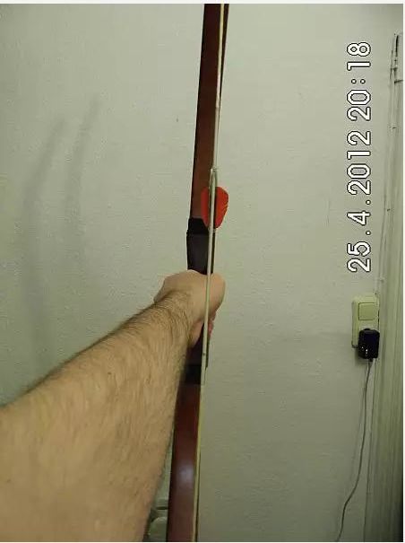 erstmal die endposition, mit mittiger trefferlage, meiner bogenhand mit aufgestecktem pfeil - um den winkel etwas deutlicher zu machen:
