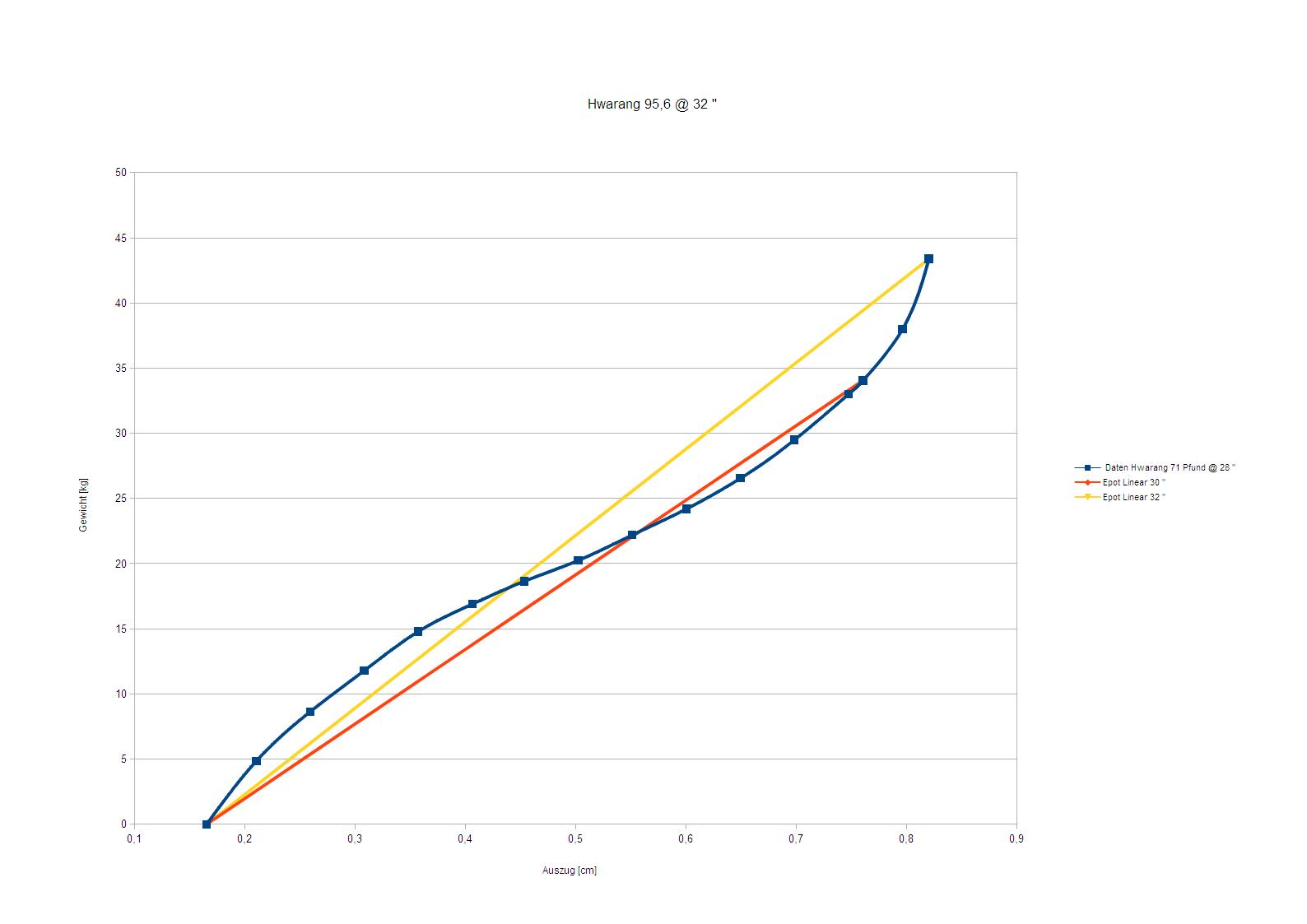 Ich füge ein Kraft-Weg Diagramm bei, aus welchem die Zugkraft bei entsprechendem Auszug abgelesen werden kann. Geschossen habe ich den Bogen mit Daumentechnik. Getestet habe bei zwei Auszügen. 30 '' mit 75 lbs und 32 '' bei 95,6 lbs (oder 34 kg bei 76 cm und 43 kg bei 82 cm). Dafür standen zwei unterschiedliche Pfeilarten 8 gr/lbs (95,6 lbs) und 7,4 gr/lbs (75 lbs) zur Verfügung. In der Tabelle sind die Auszugslängen sowie die jeweiligen Wirkungsgrade wiedergegeben. Zusätzlich dazu gebe ich an wie viel Energie ein gleich starker (Lang-) Bogen bei entsprechendem Auszug gespeichert hätte. Dies steht unter den Punkten „Epot linear 25,5“ ; Epot linear 30“ und „Epot linear 32“. Der Unterpunkt „Linear/Hwarang“ gibt an wieviel mehr Energie der Hwarang bei gegebenem Auszug gegenüber einem Langbogen speichert. Meiner Meinung nach ein wesentliches Gütemerkmal.