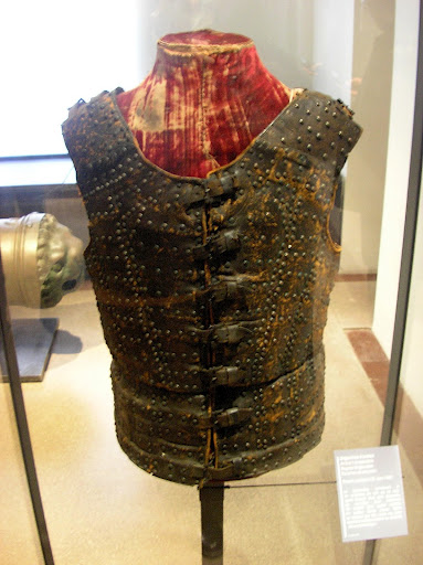 Die deutschen und fränkischen Fußkämpfer und Ritter trugen im 8. Jahrh. eine aus gepolsterter Leinwand oder Leder gefertigte, vom 13. Jahrh. ab mit aufgenähten eisernen Ringen, Ketten, Metallplatten oder dicken, vernieteten Nagelköpfen häufig gitterförmig besetzte ärmellose Panzerjacke Brünne, Bruunika oder Haubert genannt, die bis zur Hüfte reichte und noch lange von unbemittelten Edelleuten und Schildknappen getragen wurde.