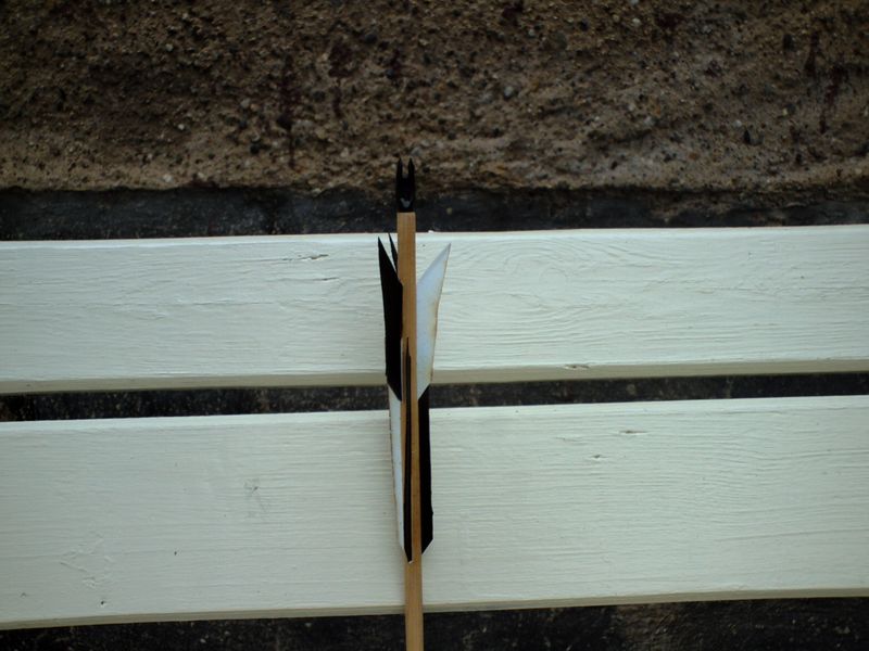 Ja, sogar nachdem ich bei den 3 Testpfeilen die vorderen Federn schon von vorne gekürzt habe. Damit bin ich aber noch nicht fertig. Die 527grn (+/- 4) schweren Pfeile fliegen fauchend und stabilisieren sich sehr schnell.