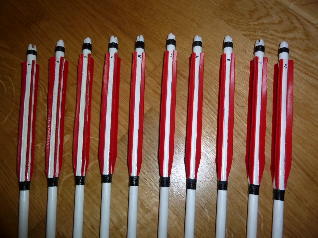 Da die Schäfte gebarrelt sind, hatte ich auch Schwierigkeiten, die Federn sauber aufzukleben - die gerade Federklammer des Befiederungsgeräts blieb ein Stück über der Ausbuchtung im Schacht kurz vor der Nocke... Na ja, hier das Ergebnis: