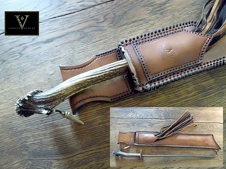 Der Köcher ist aus pflanzlich gegerbtem Leder, im Randbereich mit Lederflechtriemen aus Känguruhleder umflochten, handgelocht und handvernäht und eine kleine punzierung rundet das Teil dann ab.
